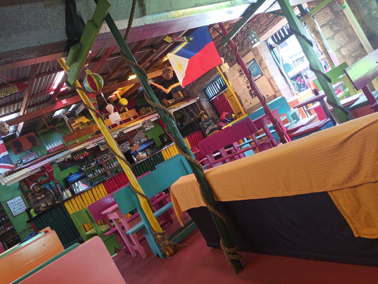 Great bar with live music, cooling mist from ceiling, buckets of beer and good atmosphere, good venue next to cruise port